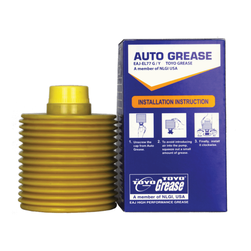 TOYO-G EAJ EL 77 AUTOGREASE is recommended for high load and high temperature industrial and automotive assembly industries. It is excellent for lubricating in pins and bushes, anti-friction / clutch / plain bearings, chains /conveyer chains and where heavy load, strong vibration, and good water resistance. It is suitable for most centralized lubrication system such as Toshiba, Sumitomo, Sodik, JSW, Nissei, Demag, Ube, Meiki, Niigata, Ferromatik, Fanuc, Toyo, Mitsubishi and other machineries.